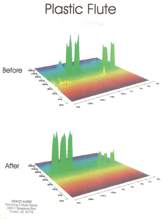 Plastic Flute: In the photos of the Plastic Flute, Before & After, note that the predominant color, representing the main range of frequencies of the single note played, is green. The other colors in the Before photo, though, are not additional harmonics; they are joist 'noise'. Notice that almost all of the noise is gone in the After photo. VortexHealing harmonized the plastic flute in a way that eliminated the noise.